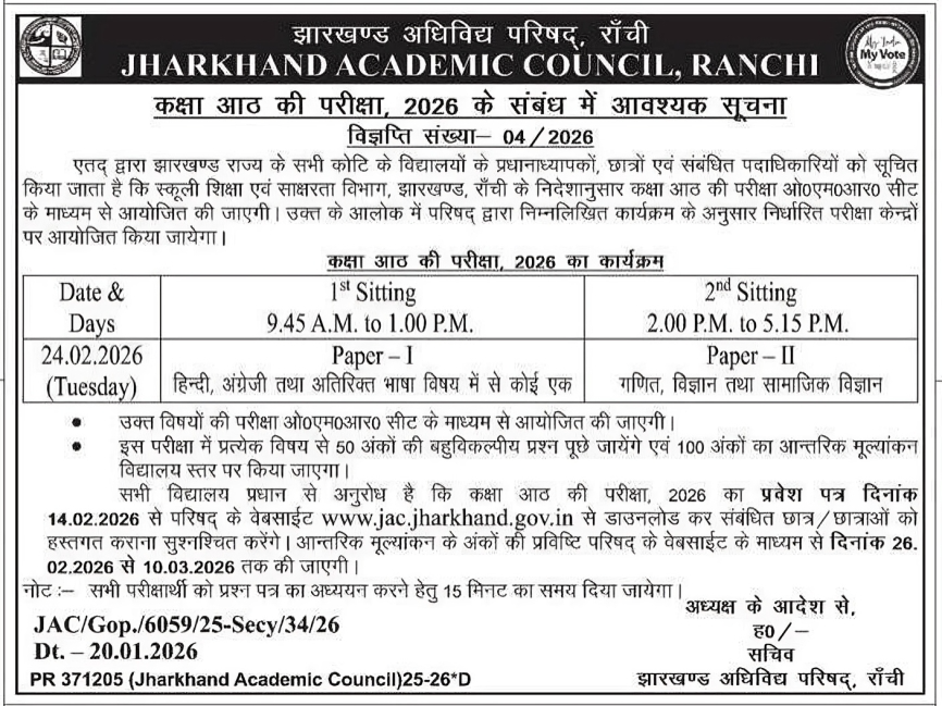 JAC 8th Time Table 2026: झारखंड एकेडमिक काउंसिल (JAC), रांची ने कक्षा 8वीं बोर्ड परीक्षा 2026 का आधिकारिक टाइम टेबल जारी कर दिया है। JAC द्वारा जारी अधिसूचना संख्या 04/2026 के अनुसार, कक्षा 8 की परीक्षा 24 फरवरी 2026 (मंगलवार) को आयोजित की जाएगी। इस परीक्षा में राज्य भर के सभी पंजीकृत छात्र शामिल होंगे। परीक्षा दो पालियों में OMR शीट के माध्यम से ली जाएगी। सभी नवीनतम अपडेट JAC की आधिकारिक वेबसाइट jac.jharkhand.gov.in पर उपलब्ध हैं।