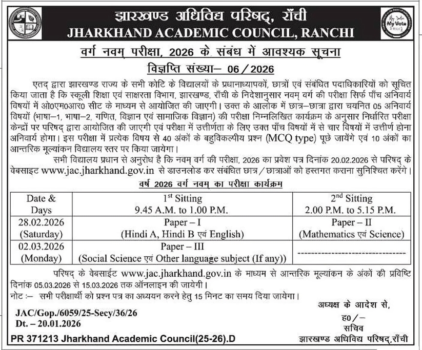 JAC ने कक्षा 9वीं की परीक्षा जनवरी 2026 में आयोजित करने की योजना बनाई है। परीक्षा का आयोजन दो पालियों में होगा:
